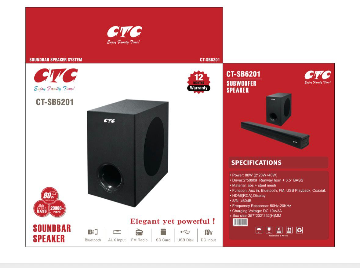 9%CTC CT-SB6201 Soundbar Speaker System with Subwoofer – 80W Bluetooth Soundbar, USB/SD, HDMI, FM Radioksh 9,999ksh 6,990